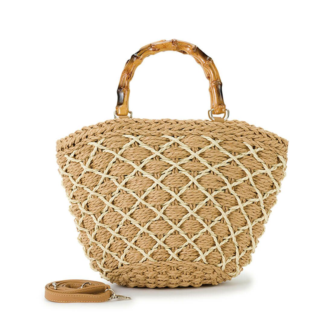 ナチュラルな風合いが魅力の、かご風ハンドバッグ。 ハンドル部分にも木のテイストを取り入れ、細部にまでこだわったデザインが目を引きます。 ファスナー開閉式で荷物が飛び出しにくく、ショルダーベルト付きで肩掛けも可能な2way仕様。 見た目の可愛らしさだけでなく、実用性にも優れています。 手作業の温もりが伝わる編み込みが、日常にささやかな高揚感を添えてくれる一品です。 お出かけやレジャーシーンにぴったりで、持つだけで季節感と遊び心をプラス。 毎日を少しだけ特別にしてくれる、そんなバッグです。