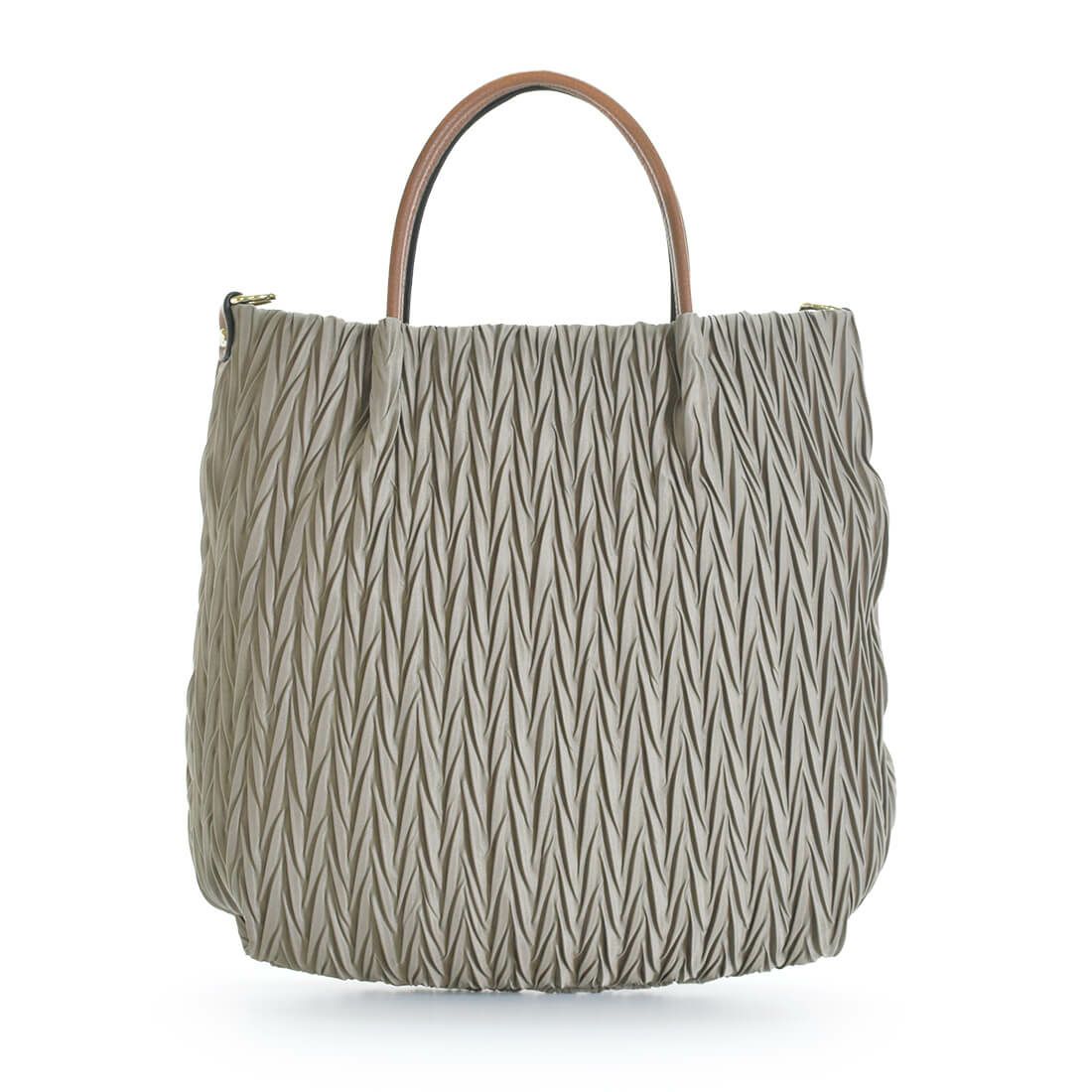 ナイロンにプリーツ加工を施したトートバッグ。 程よい光沢のあるナイロンを使用しているので、肩への負担がかかりにくい軽量設計です。 バッグの間口は安心のファスナータイプ。マチがあるので、必要なものが収まるサイズ感になっています。 すっきりとした印象の細めベルトが付属しているので、用途に合わせて手持ちバッグから肩掛けバッグに変えられるのがうれしいポイントです。 普段使いからレジャーシーンまで活躍するバッグです。