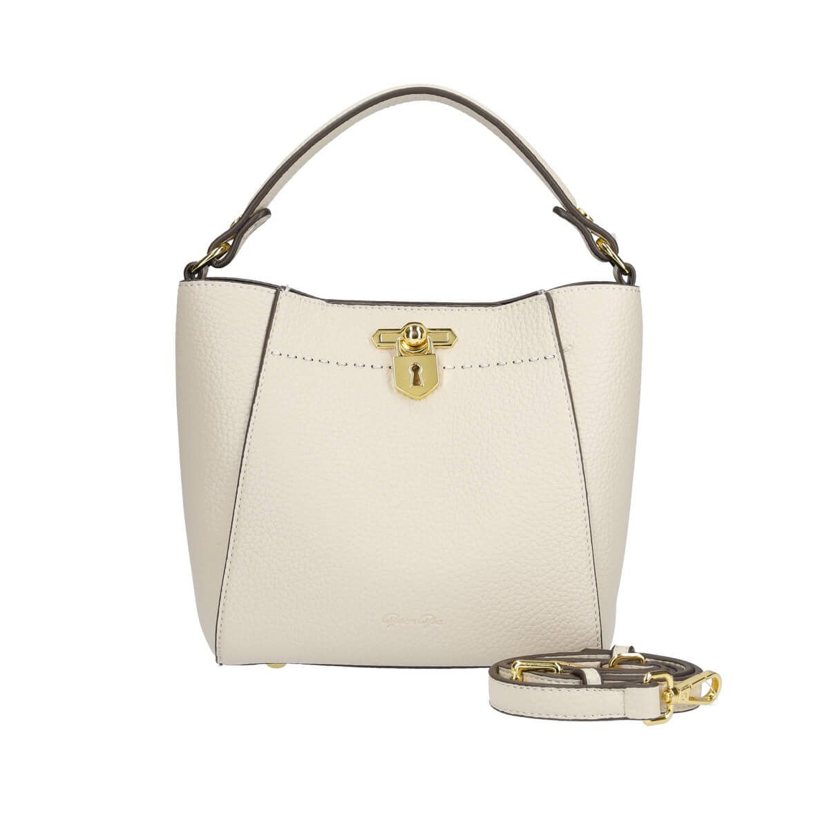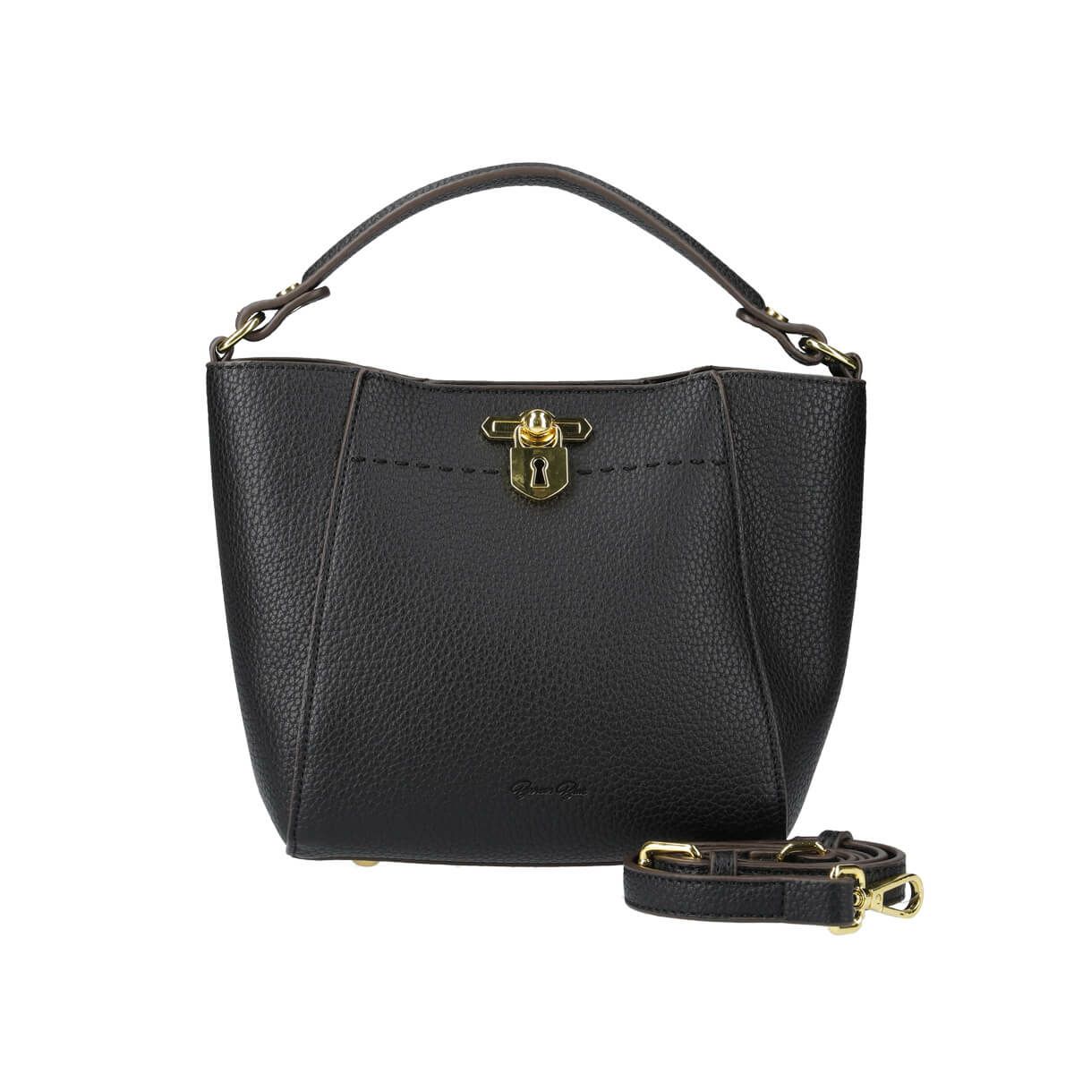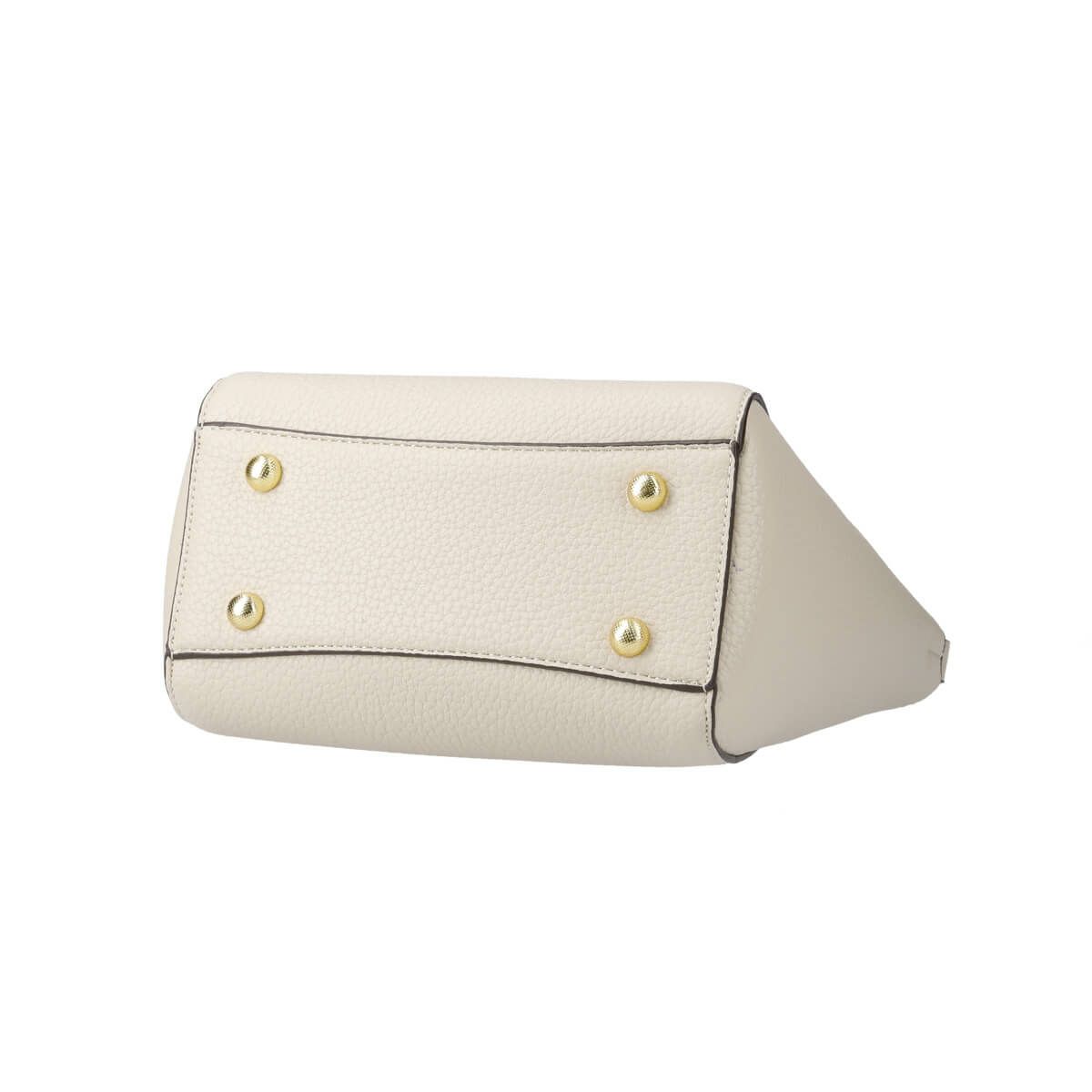 キーチャームが可愛らしい小ぶりなハンドバッグ。間口が大きく、マチも幅広で見た目よりも大容量です。お出かけにうれしいポーチ付きで、機能性とデザイン性を兼ね備えたアイテムです。