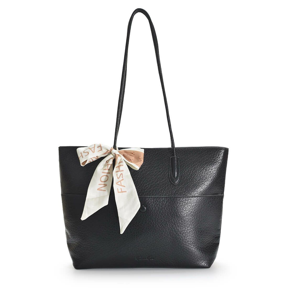 シンプルなバッグにアクセントのリボンが映えるおしゃれなバッグ。 しっとりした触り心地が高級感を漂わせるバッグは、A4サイズ対応で使い勝手抜群。 前ポケットや内ポケットが充実しており、整理整頓もラクラク。 リボンはさりげなくクマちゃん柄となっており、ユニークで可愛らしいデザインがお好きな方にはたまらない仕様です。 シンプルながら遊び心にあふれたバッグです。