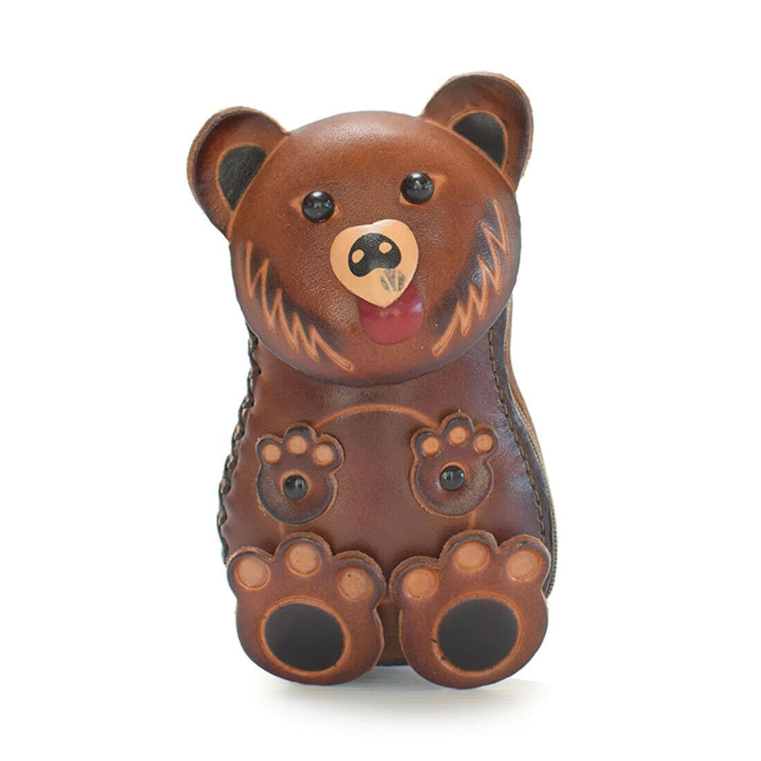 クマのぬいぐるみを彷彿とさせる、愛らしいシルエットのポーチ。 ハリと艶が美しい牛革を使用。 背面にファスナー付きの収納部があり、鍵や小銭などを収納していただけます。 ストラップ付きで、バッグのハンドルなどにぶら下げてお使いいただけます。 お茶目な表情が可愛らしく、贈り物にもぴったりのアイテムです。